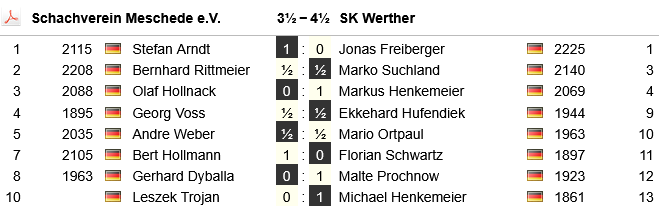 So gewinnen wir zum dritten Mal in dieser Saison mit einem hauchdünnen 4,5:3,5-Vorsprung. Nur ein Sieg fehlt jetzt noch für den Klassenerhalt, denn acht Punkte sollten reichen. Das muss in den ausstehenden fünf Begegnungen doch wohl möglich sein. Hier sind die Einzelergebnisse des Kampfes:
