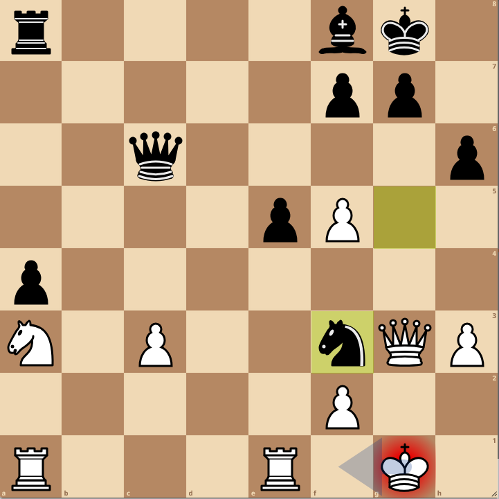 In der Schlussstellung lässt sich Manuel Dargel den Turmgewinn nicht mehr zeigen. Egal wohin der König ausweicht, entweder ich erobere mit Schach seinen Turm auf c1 oder auf h8: