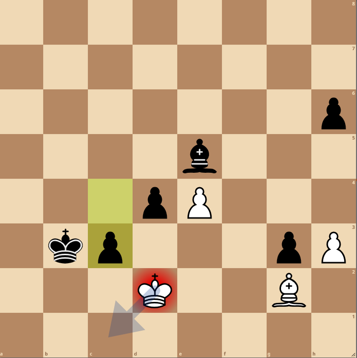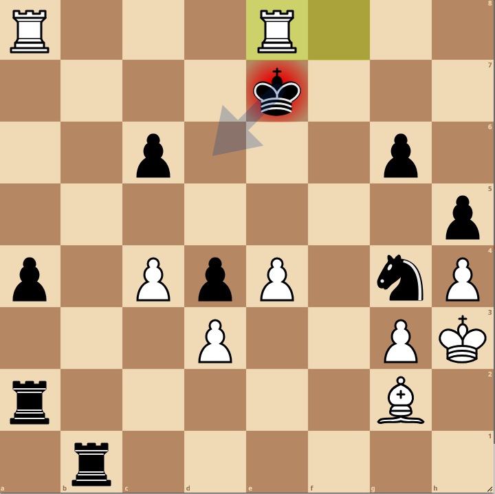 In obiger Stellung hätte ich Kd6 finden müssen. Ich aber zog Kd7 und die Computerbewertung sackt von -5,9 auf 0 zusammen Zuhause schlug ich mehrfach meine Stirn auf die Tischplatte wie ein pickendes Huhn. Jonas sagte, er hat sich für mich geschämt, als er sah, dass ich das nicht gewinne.