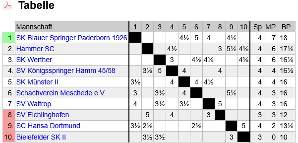 Die Tabelle ist kaum aussagekräftig. Denn zwei Mannschaftkämpfe des zweiten Spieltags wurden in den November verlegt. Ich zeige sie trotzdem: